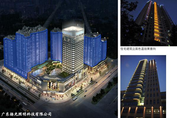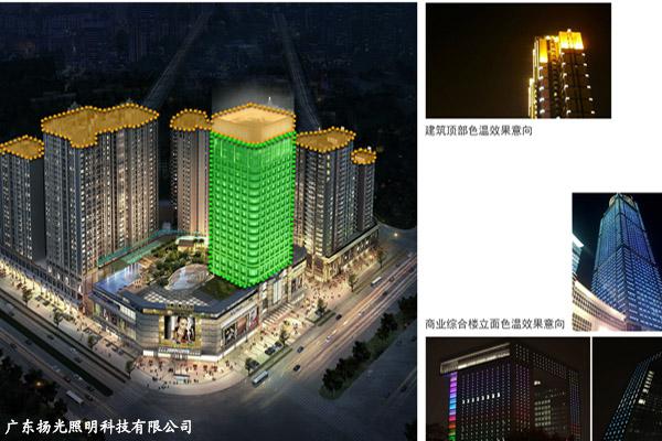商業(yè)綜合樓立面面對(duì)著人流量較多,是燈光靚現(xiàn)的重要區(qū)域。色溫可選用暖黃或彩色光體體現(xiàn)現(xiàn)代時(shí)尚感。