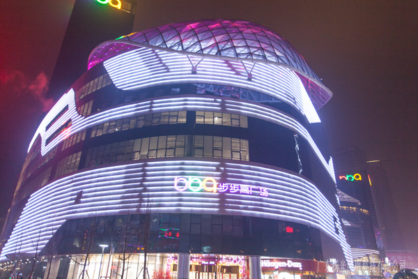 從建筑外立面上看,步步高廣場頗有特色。從外廣場外乘坐直達內部4樓的80米通天梯,外觀采用穿孔無規則效果,隨著電梯緩緩往上前行,城市之景逐步納入眼簾,景色遼闊。而項目的穹頂則采用了國家水立方式的穹頂設計,建筑天棚以鋼模結構為主,材質適用于投光、點光的照明手法。