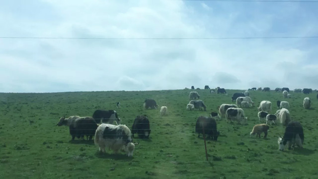 看慣了家鄉的山山水水,這樣毫不掩飾地坦露的自然美景、展示著大自然的本來面目,無意間給人一種震憾,一種真實,一種坦蕩;草地上大群的白色山羊和黑色的牦牛低著頭吃草,在這驕陽似火的七月,站在海拔3520米的日月山山口,凜冽的寒風急掠而過,竟然令人瑟瑟發抖。下車,在頂峰日月山碑旁大家拍照留念,心曠神怡。