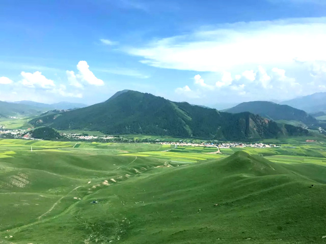 在7、8月份,高山牧場的野花把草原點綴得五彩繽紛,如綢似錦;數不盡的牛羊膘肥體壯,若隱若現;成片的油菜花在湖邊肆意開放,藍天白云映襯下的金黃、嫩綠,打造出一片絕美的曠世風景。